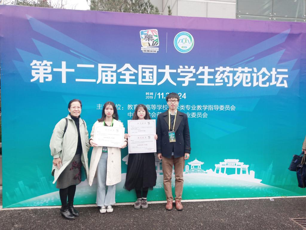 2019年11月22日-24日,由教育部高等学校药学类专业教学指导委员会和中国药学会药学教育专业委员会主办,山东大学承办的第十二届全国大学生药苑论坛在山东大学举行。我校药学院派出了“药学服务”和“药剂学”两支队伍参赛。经过壁报交流、论文评选、学生答辩等多环节的激烈角逐,由喻翠云、谢伟全老师指导的周芊芊、许彬和张斌等同学的参赛作品《以江西瑞金高轩村和湖南涟源申家村为例的空巢老人用药调查》获得创新成果一等奖和优秀论文奖;刘阳老师指导的谢红花、熊菀伶和刘惠美等同学的参赛作品《新型温敏水凝胶用于构建肿瘤多细胞球》获得创新成果二等奖。
