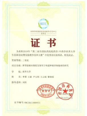10月17日-19日,由高等学校国家级实验教学示范中心联席会和中国药科大学主办,天津大学药物科学与技术学院承办的“第二届医药院校药学/中药学世界大学生创新创业暨实验教学改革大赛”在天津举办。经过初选函评和现场答辩等多环节激烈角逐,由我校选送的药学院刘阳老师指导的“生物医用水凝胶创新团队”的成员李蓉、王毅、尹玉利、王云娟、黎倩瑶等参与的项目最终荣获学生创新创业二等奖。