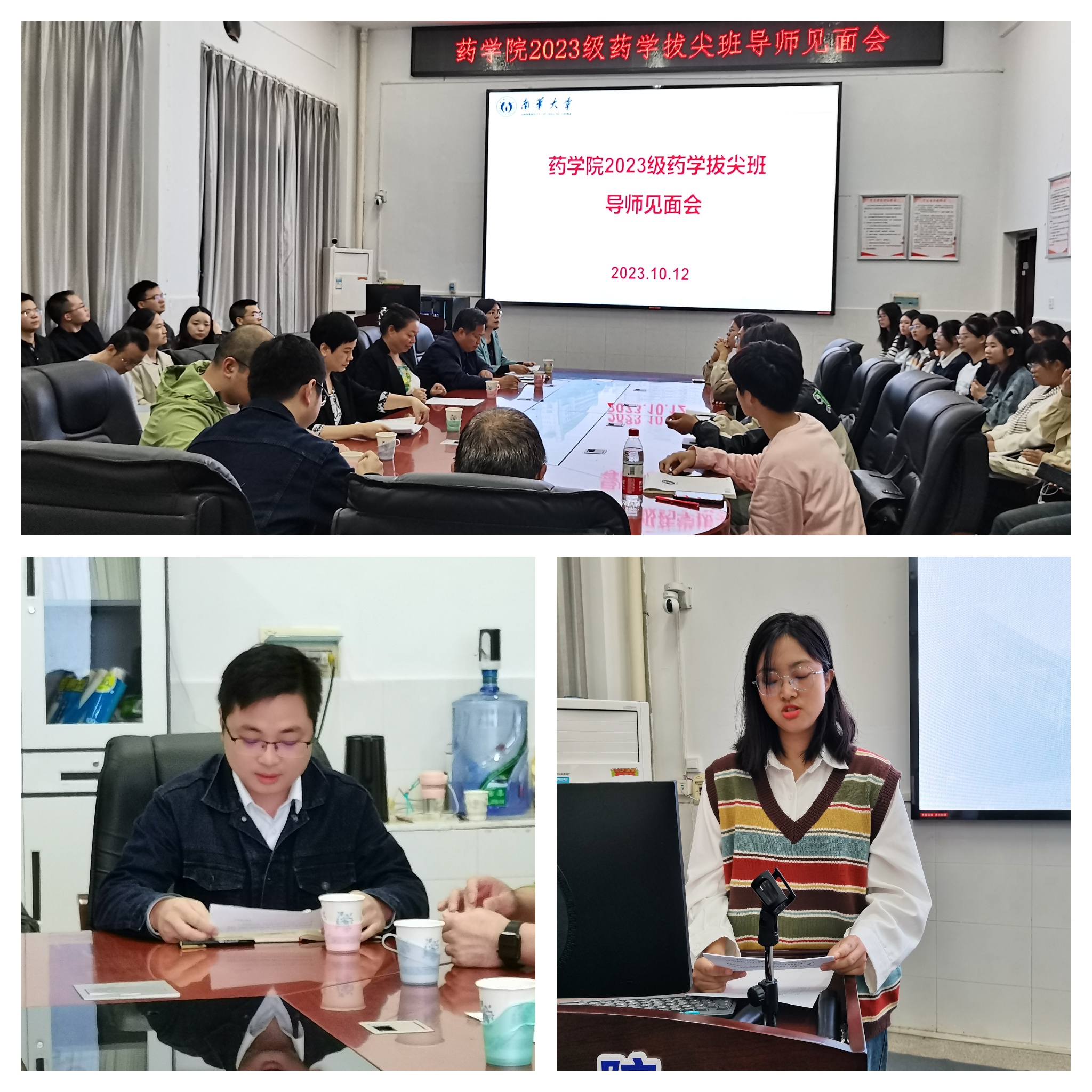 10月12日上午,我院在药学楼B栋101会议室召开了2023级基础医学(药学)拔尖班师生见面会。药学院院长喻翠云、副书记陈健平、副院长易岚、副院长王力立、全体拔尖班导师、教务办、学工办老师以及2023级药学拔尖班全体同学参加了见面会。教务部部长彭国文应邀出席了会议,会议由陈健平副书记主持。