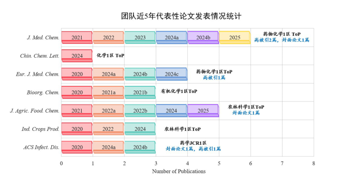 本团队在天然药物化学领域取得系列研究成果,相关成果发表在J. Med. Chem., Chin. Chem. Lett., Eur. J. Med. Chem., J. Agri. Food Chem., Ind. Crop Prod.等中科院1区TOP期刊,其中包含ESI 1%高被引论文4篇、封面论文3篇,展现了团队在抗菌药物研发领域的学术影响力。