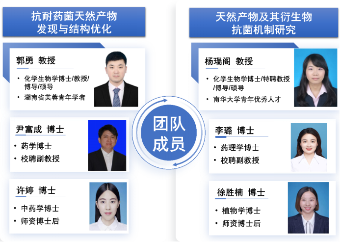 南华大学天然抗菌药物研究团队成立于2023年,团队由2名南华大学特聘教授、2名校聘副教授、2名校师资博士后和约20名硕/博研究生组成。团队聚焦天然产物抗菌资源挖掘与药物创制,系统开展抗多重耐药菌天然产物先导发现、作用机制阐明、抗菌制剂及成药性评价,为攻克耐药菌感染提供创新药物与技术支撑。研究成果在J. Med. Chem., Chin. Chem. Lett., Eur. J. Med. Chem., J. Agri. Food Chem.等国际学术期刊上发表,入选封面论文3篇,ESI 1%高被引论文4篇。团队获多项国家自然科学基金等国家级和省部级项目资助,授权多项国家发明专利。