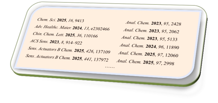 团队于2020年成立以来,在医用荧光材料设计和医学诊疗应用领域进行了深入研究,积累了丰富的研究经验,并取得了一些研究成果。以南华大学为通讯单位在Chem. Sci.、Anal. Chem.、ACS Sens.、ACS Appl. Mater. Interfaces、Adv. Healthcare Mater.、J. Hazard. Mater.、Chin. Chem. Lett.等顶级国际期刊上发表40余SCI论文,其中20余篇为中科院一区论文,2篇入选高被引论文。近三年部分代表性论文如下: