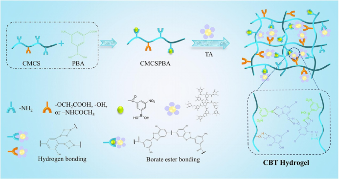 图1基于苯硼酸改性羧甲基壳聚糖的多功能水凝胶的制备示意图