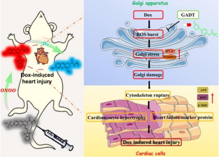 阿霉素(Dox)作为一种广谱蒽环类抗生素,一直是化疗方案的基石药物。然而,超过半数使用Dox的患者在一年内会出现心脏损伤,这种副作用极大地限制了其临床应用,且机制尚未明确。Dox在体内经烟酰胺腺嘌呤二核苷酸脱氢酶(NADH)、内皮型一氧化氮合酶(eNOS)还原酶等多种酶作用后,会产生超氧阴离子(O2.-),这些活性分子进一步与周围的一氧化氮结合,生成毒性更强的过氧亚硝酸盐阴离子(ONOO-),通过激活基质金属蛋白酶等途径,最终导致心肌细胞损伤。因此,监测O2.-和ONOO-浓度的波动或成为研究阿霉素心脏毒性的关键。高尔基体是真核细胞中的一种重要细胞器,当高尔基体受到诸如活性氧爆发等外部应激时,其形态发生改变,导致其内部成分的重新分配和蛋白质分泌和修饰的改变,此过程被称为高尔基应激。现今已有大量文献报道高尔基应激参与了各种重大疾病的发生发展,但是这一过程的具体分子机制仍未被揭示。为此,南华大学药学何隆薇教授团队和陈临溪教授团队进行深入合作研究,首次将高尔基体作为研究阿霉素心脏毒性的核心靶点,并成功开发了相应的诊断和治疗工具。