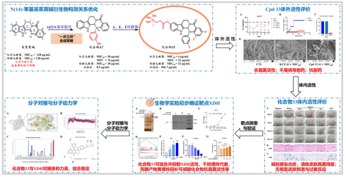 彭颖博士所在王震教授团队,前期研究发现吴茱萸碱14位N引入苯基后,其抗真菌活性与代谢稳定性均实现显著提升,进而筛选出具有良好体内外抗真菌活性和安全性的化合物A7,优于一线抗真菌药物酮康唑(Bioorg. Chem., 2022, 127:105981)。为进一步提升成药性,本研究采用“水溶性基团引入”策略,同步优化其溶解性与活性。团队构建了>100个吴茱萸碱衍生物库,通过深入构效关系分析,得到了溶解性良好、抗真菌强的化合物33。体内外活性研究表明,化合物33可高效的抑制孢子萌发、破坏真菌菌丝、杀灭真菌,进而显著抑制豚鼠皮癣感染,治疗效果优于阳性对照药物酮康唑。此外,化合物33不易诱导真菌产生耐药性,对酮康唑耐药菌株仍能保持稳定活性。机制研究揭示出化合物33通过结合并抑制真菌嘌呤代谢关键限速酶——黄嘌呤脱氢酶(xanthine dehydrogenase,XDH),干扰真菌嘌呤代谢,造成真菌死亡,进而发挥高效杀真菌活性。