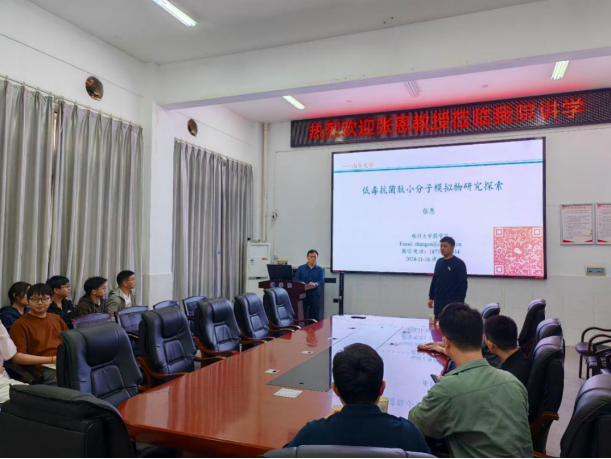2024年11月16日下午3点,郑州大学张恩教授应365英国上市的邀请,在药学楼B101会议室作题为《低毒抗菌肽小分子模拟物研究探索》的报告。报告由药学院郭勇教授主持。