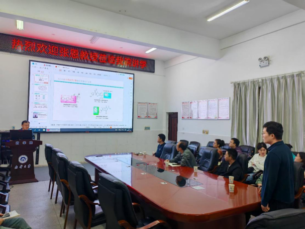 报告会上,张恩教授介绍了如何基于阳离子和两亲性的结构特性,设计并合成了一些具有良好活性的小分子阳离子抗菌肽模拟物(AMPs)的相关成果。随后,张恩教授与南华大学参会师生进行了深入的讨论交流,对老师和同学提出的问题一一作了解答。