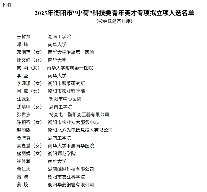 近日,根据中共衡阳市委人才工作领导小组办公室、衡阳市科学技术协会《关于开展2025年衡阳市“小荷”科技类青年英才专项申报工作的通知》(衡市科协字〔2025〕9号)文件精神,经申报、推荐、评审、考察、个人事项审查等程序,评选出2025年市“小荷”科技类青年英才专项拟立项人选20名。其中,药学院李坚博士成功入选2025年衡阳市"小荷"科技人才。