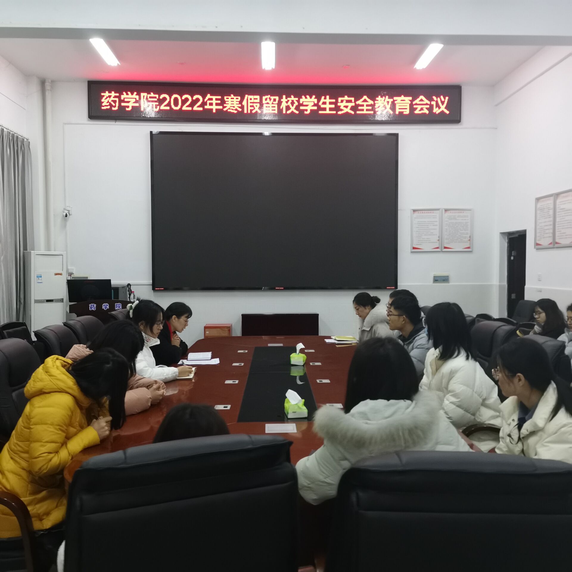 为做好寒假留校学生的安全教育工作,提高留校学生安全防范意识,1月8日下午17:00,药学院在新二教B栋101会议室召开2022年寒假留校学生安全教育会议。院党委副书记陈健平、院学工室主任单云丽、辅导员彭翔、姚顺超以及留校本科生和研究生代表参加此次会议。会议由单云丽主持。