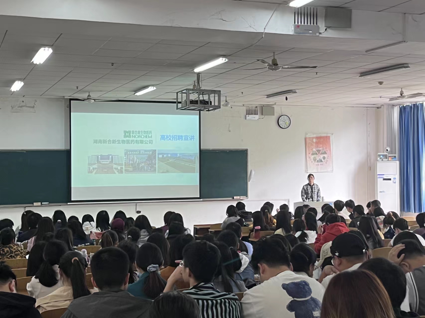 5月17日,湖南华纳大药厂股份有限公司宣讲会在南华楼312教室举办。宣讲会分两个阶段,首先由该公司王敬博士向同学们授课,介绍公司在连续化反应技术上的优势。接着,由公司人力资源招聘经理蒋兴从企业规模、生产基地、公司重点产品、青年人才计划、实习待遇、实习要求与安排等方面为学生介绍了华纳大药厂股份有限公司情况。