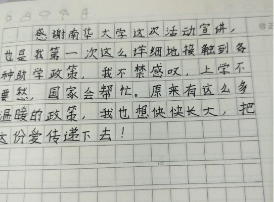 “感谢南华大学这次宣讲,这也是我第一次这么详细地接触到各种助学政策。上学不要愁,国家会帮忙。我也想快快长大,把这份爱传递下去。”坳头小学学生朱文忠在作文纸上郑重写道。这是一场爱与希望的接力赛,资助政策正是这份连接人心、传递温暖的纽带。