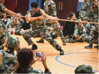 各参赛连队早早齐聚赛场,队员们摩拳擦掌、眼神坚毅,有的围圈搭肩高喊口号,有的屈膝沉腰模拟发力。裁判哨响划破长空,赛场瞬间沸。麻绳两端的选手紧握长绳,脚掌如钉嵌地,腰背如弓蓄力。当“加油”声浪涌起,百余双臂同时发力,麻绳绷成满月。这场较量中,既有狭路相逢的胶着:红绸带在中线处来回震颤,双方队员牙关紧咬,连呼吸都带着较劲的节奏;亦有势如破竹的捷报:连队凭借默契的号子声与爆发式发力,将对手连人带绳拖拽过线,赢得满堂喝彩。场外,未参赛同学组成啦啦队,加油的呐喊层层叠叠,推着选手们挺过极限。