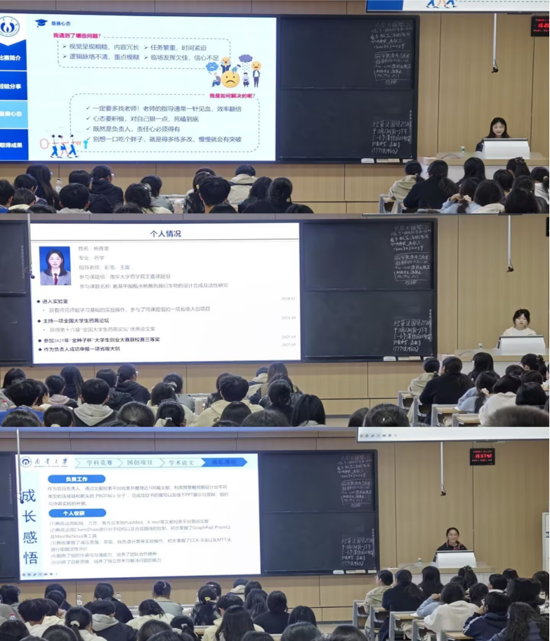 随后,参与国家级大创项目的优秀学生团队依次登台,进行项目成果汇报与经验分享。曾羡麟、杨雅雯、赵泽艳、舒晴四位同学分别通过PPT演示与现场讲解相结合的方式,系统介绍了项目的研究背景、创新亮点、实施过程及取得成果。展示项目覆盖药物研发、药剂学、药物分析、药理学等多个药学细分领域,彰显了药学院学子扎实的专业功底、蓬勃的创新活力与出色的实践能力。他们同步分享了项目攻坚经验,为低年级学生提供可复制的双创路径。