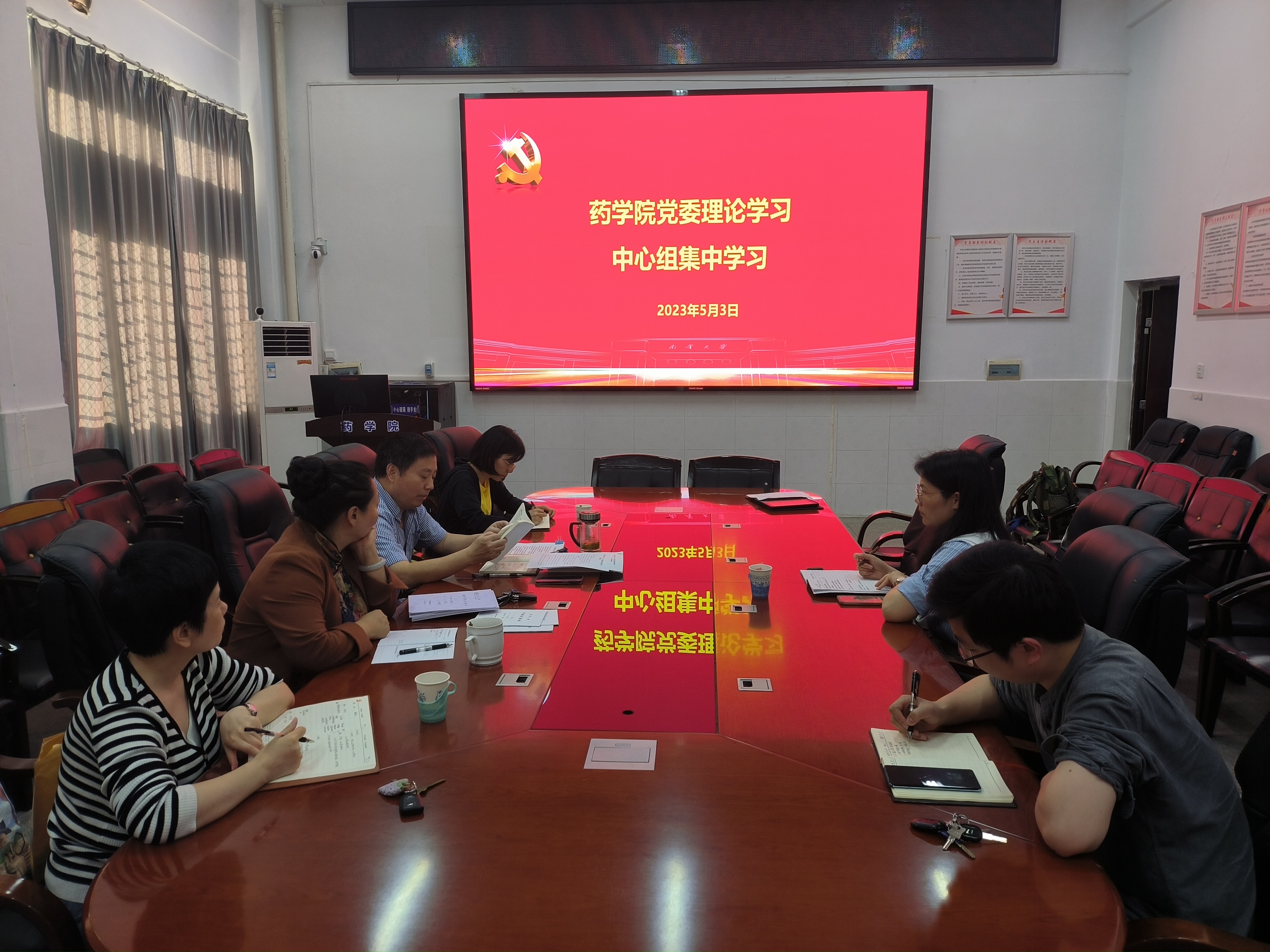 5月3日下午,药学院党委在药学楼B101会议室举行中心组集体学习会暨“以学铸魂践忠诚”专题研讨。院党委书记袁中华主持,喻翠云、陈健平、易岚、王力立、彭俊梅、黄朝晖等7名党委委员参加。