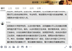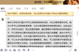 习近平总书记强调:“要推动乡村人才振兴,把人力资本开发放在首要位置,强化乡村振兴人才支撑”。随着新时代背景下国家发展的需要,农村经济发展的加速和现代农业技术的不断推广,农村人才的需求日益渐大,但由于农村基础设施相对落后,人才待遇普遍较低、发展机遇和前景也不如城市,使得农村很难留住人才。在学习过后,教师第二党支部书记彭俊梅组织大家在教职工理论学习群里就“如何利用我们自身优势,充分发挥南华大学在乡村振兴中的社会服务职能”进行了交流讨论。其中,魏华说:“在全面推进乡村振兴的历史进程中,高校在人才、科研、文化等方面具有鲜明的优势,应自觉担负起历史使命与责任。高校在助力乡村振兴的进程中,应充分发挥学科、科技、智力和人才优势,因地制宜,精准施策,深入挖掘乡村特点,发展乡村产业、乡村经济、乡村文化与乡村生态。在充分考虑乡村建设实际的基础上,构建乡村振兴政策体系,引导资金、技术、人才等资源向农业农村配置,推动农业农村高质量发展。对高校来说,采取校地共建形式,对接一个乡镇或村,建设一个高校服务乡村振兴的区域示范基地,是一条值得探索的服务乡村振兴的新路径。同时,高校更好地服务乡村振兴,也需进一步明确努力方向,提升服务能力和质量。我们要把准乡村振兴战略要求,提升服务能力,根据乡村振兴战略实施需要对专业学科设置、科学研究方向等作出相应调整,提升服务乡村振兴战略的能力。应进一步加强校地合作平台建设,把服务乡村振兴战略的设计纳入地方经济社会发展的计划中去,创新校企合作共建机制,发挥高校的人才和科研优势,发挥企业在资金和产业链延伸等方面的优势,积极探索产学研无缝对接的有效模式和共同培育高素质技术人才的长效机制。让高校科技创新为乡村振兴提供‘原动力’,还需要体制机制的保障。特别是在深入推进教育评价改革的背景之下,优化科研评价机制,在相关学科和研究领域,建立以服务乡村质量或效果作为重要科研评价指标的评价体系、考核办法和奖励机制,有效激发了高校科技人员投身乡村振兴的积极性。”