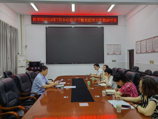 2024年7月5日下午,药学院第7次中心组集中学习暨党纪学习专题研讨会在药学楼B101会议室举行。会议由院党委书记袁中华主持,全体党委委员及综合科主任参加学习会。