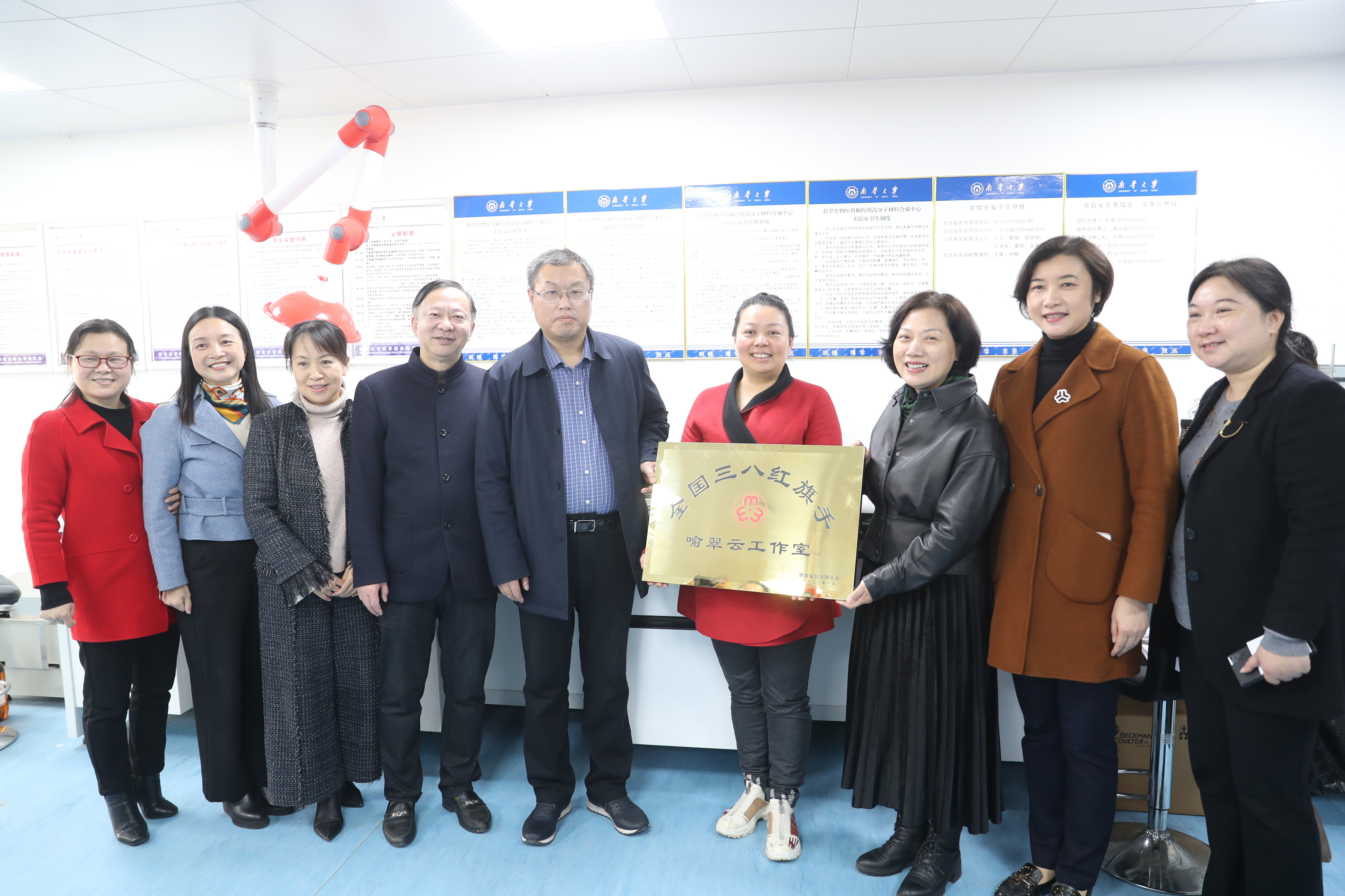 3月3日上午,全国三八红旗手喻翠云工作室授牌仪式在南华大学医研楼五楼举行,省妇联副主席卢妹香、南华大学副校长姜志胜共同为喻翠云授牌——“全国三八红旗手喻翠云工作室”,出席仪式的还有市妇联党组书记、主席谌惠渝,市妇联党组成员、副主席龙华、 廖朝霞,及南华大学工会常务副主席潘本衡、药学院党委书记袁中华、院长喻翠云等相关部门人员。