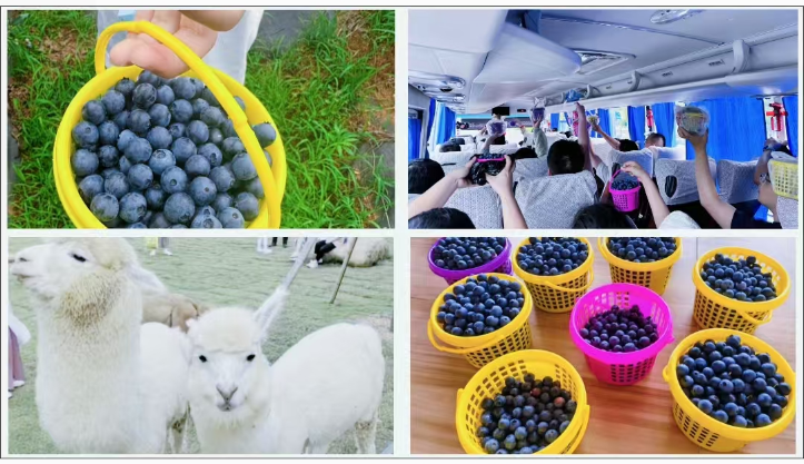 午后,大部队前往蓝美乡侬园,走进蓝莓种植区,体验采摘乐趣。老师们化身“果农”,小心翼翼地采摘,体会劳动与收获的快乐。园内的萌宠乐园更是为本次春游增添了趣味,温顺的羊驼、灵动的梅花鹿,人与自然的和谐在此刻生动呈现。
