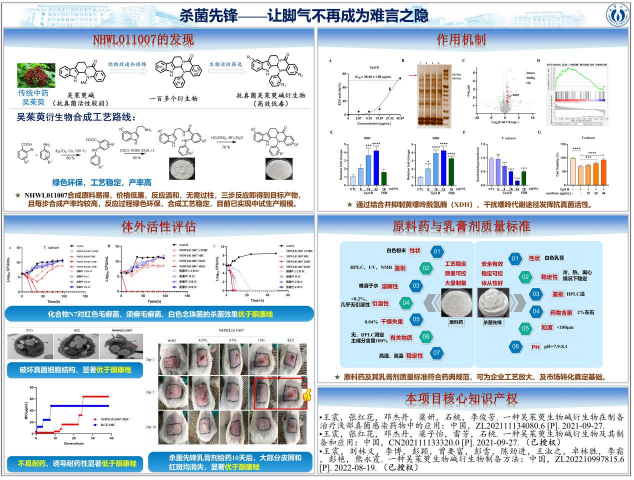 “杀菌先锋”团队由跨学科硕博研究生组成,核心成员在药物合成、制剂研发、市场运营等领域具备专业优势。此次获得省级基金支持,不仅是对项目技术创新性的认可,更彰显了大学生在生物医药领域的创业活力。项目预计未来5年提供200余个就业岗位,助力中医药现代化与国际化,响应“健康中国2030”规划及《遏制微生物耐药国家行动计划》,为全球浅部真菌感染患者带来福音。