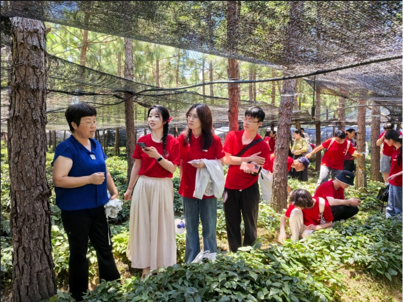 在虎形村千亩淫羊藿种植基地,“湘村药匠”实践团的学生们正弓着腰除草。“叶片带刺是天然的防虫屏障吗?”“林下套种的淫羊藿,皂苷含量能超药典标准5-8倍,具体怎么实现的?”学生们的问题一个接一个,直戳产业核心。种植带头人、国富生物科技总经理朱春燕介绍:“我们坚持生态种植,不用除草剂、只施有机肥,模拟野生环境。但品种优化、深加工技术还存在短板,急需技术支持。”药学院院长王震实地考察后,针对产业需求与朱春燕交流探讨。“我们有药学学科优势,可以在有效成分提取、功能性产品研发等方面提供技术支持,助力‘小草经济’升级为‘大产业’。”