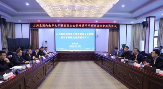 10月29日,石药集团向南华大学教育基金会捐赠药学学科建设经费签约仪式在南华大学第一办公楼视频会议室举行。党委委员、副校长王利华主持仪式。党委委员、副校长夏昆,石药集团药品事业部总裁于立朝等出席活动。