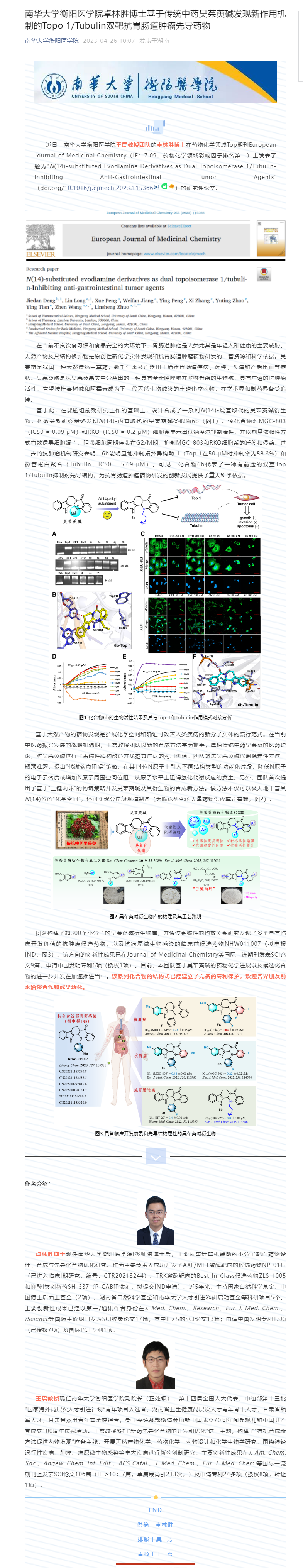 近日,南华大学衡阳医学院、肿瘤微环境响应药物研究湖南省重点实验室王震教授团队的卓林胜博士在药物化学领域Top期刊European Journal of Medicinal Chemistry(IF:7.09,药物化学领域影响因子排名第二)上发表了题为“N(14)-substituted Evodiamine Derivatives as Dual Topoisomerase 1/Tubulin-Inhibiting Anti-Gastrointestinal Tumor Agents”(doi.org/10.1016/j.ejmech.2023.115366)的研究性论文。
