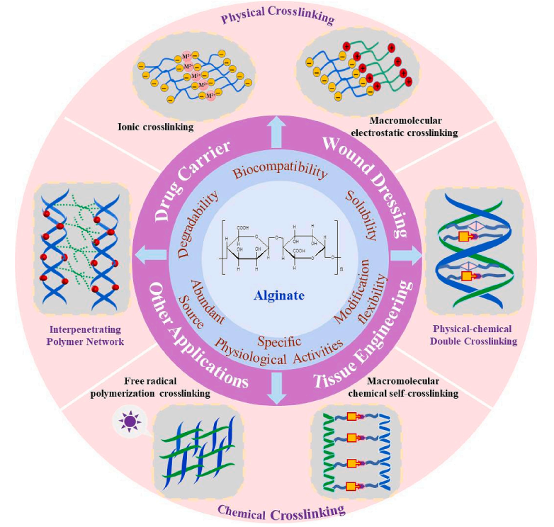 据悉,开发具有新颖结构和多重功能的水凝胶医药产品已成为生物医学领域的研究热点。其中,由多糖、蛋白质等天然物质构成的天然水凝胶由于来源丰富、价格低廉以及优异的生物相容性、可降解性和非免疫原性等优点而备受关注。而海藻酸是一种主要来源于海带、巨藻等褐藻的天然多糖,具有良好的稳定性、黏附性、细胞相容性以及降血糖、抗氧化、增强免疫活性等生理作用,因而以其为基础构建而成的水凝胶在生物医学领域具有广泛的应用前景。