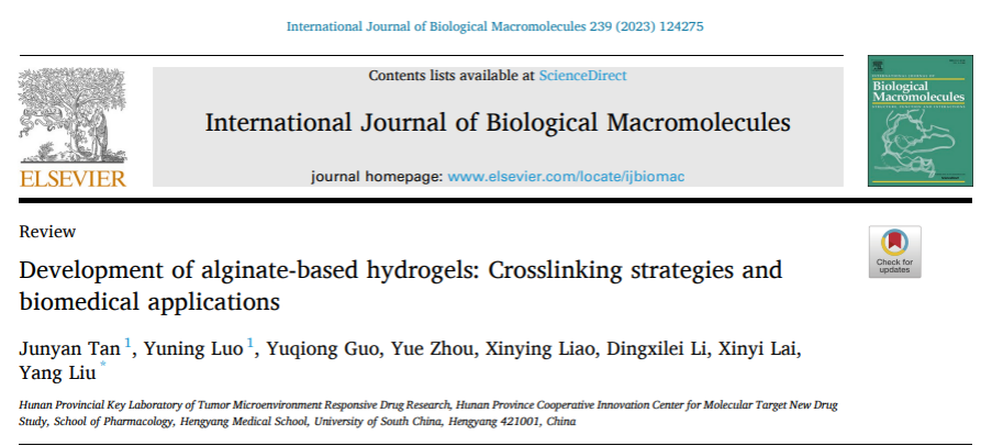 近日,南华大学衡阳医学院药学院药学专业本科生谭俊艳等在国际期刊International Journal of Biological Macromolecules(《国际生物大分子杂志》,中科院1区Top期刊)在线发表题为“Development of Alginate-based Hydrogels: Crosslinking Strategies and Biomedical Applications(基于海藻酸的水凝胶的研究进展:交联策略和生物医学应用)”的论文。南华大学衡阳医学院药学院为该论文的唯一单位,谭俊艳和硕士生罗宇宁为共同第一作者,肿瘤微环境响应药物研究湖南省重点实验室青年教师刘阳博士为通讯作者。