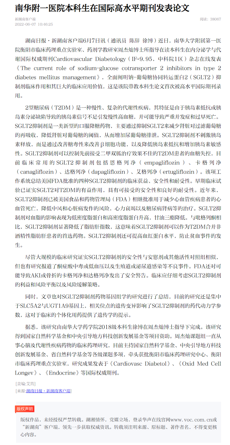 该研究由365英国上市2018级本科生徐博在周杰灿博士指导下完成。该研究得到国家自然科学基金和中央引导地方科技创新发展基金等项目资助。周杰灿课题组一直从事心脑及代谢性疾病药物的临床药理研究,目前主持国家自然科学基金、中央引导地方科技创新发展基金、省自然科学基金等各级课题多项,牵头获批衡阳市临床药理研究中心、衡阳市临床药理重点实验室,研究成果发表于《Cardiovasc Diabetol》、《Oxid Med Cell Longev》、《Endocrine》等国际权威期刊(https://m.voc.com.cn/wxhn/article/202206/202206071046253583.html)。