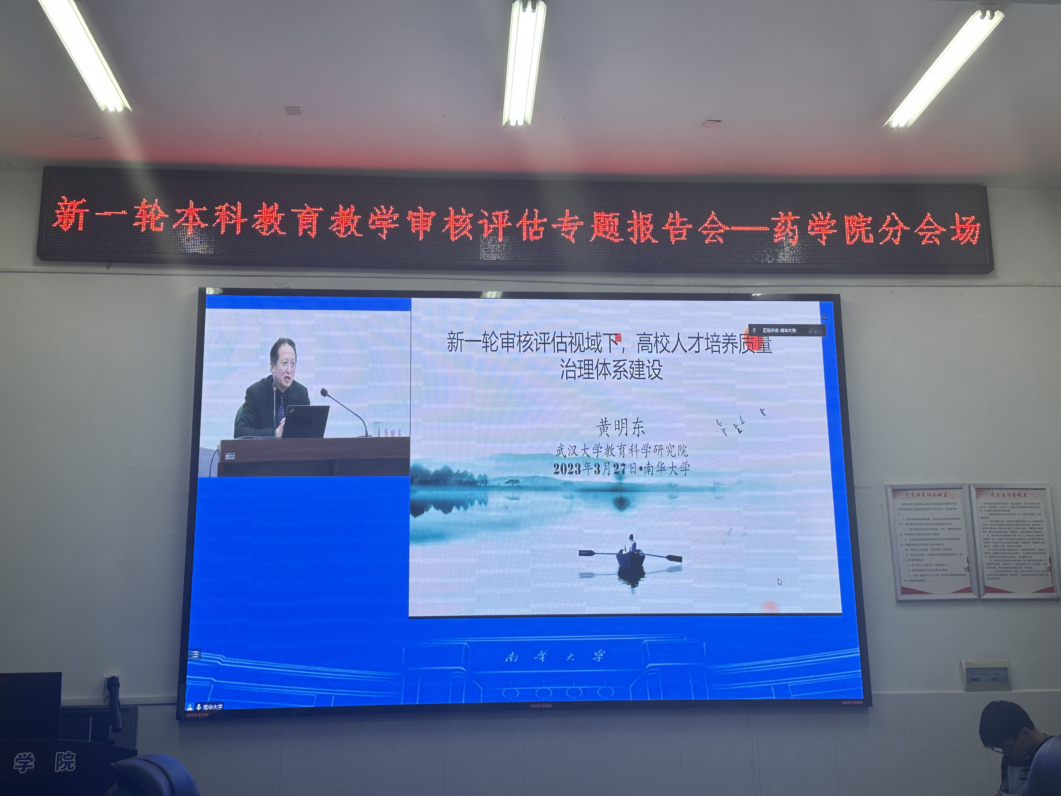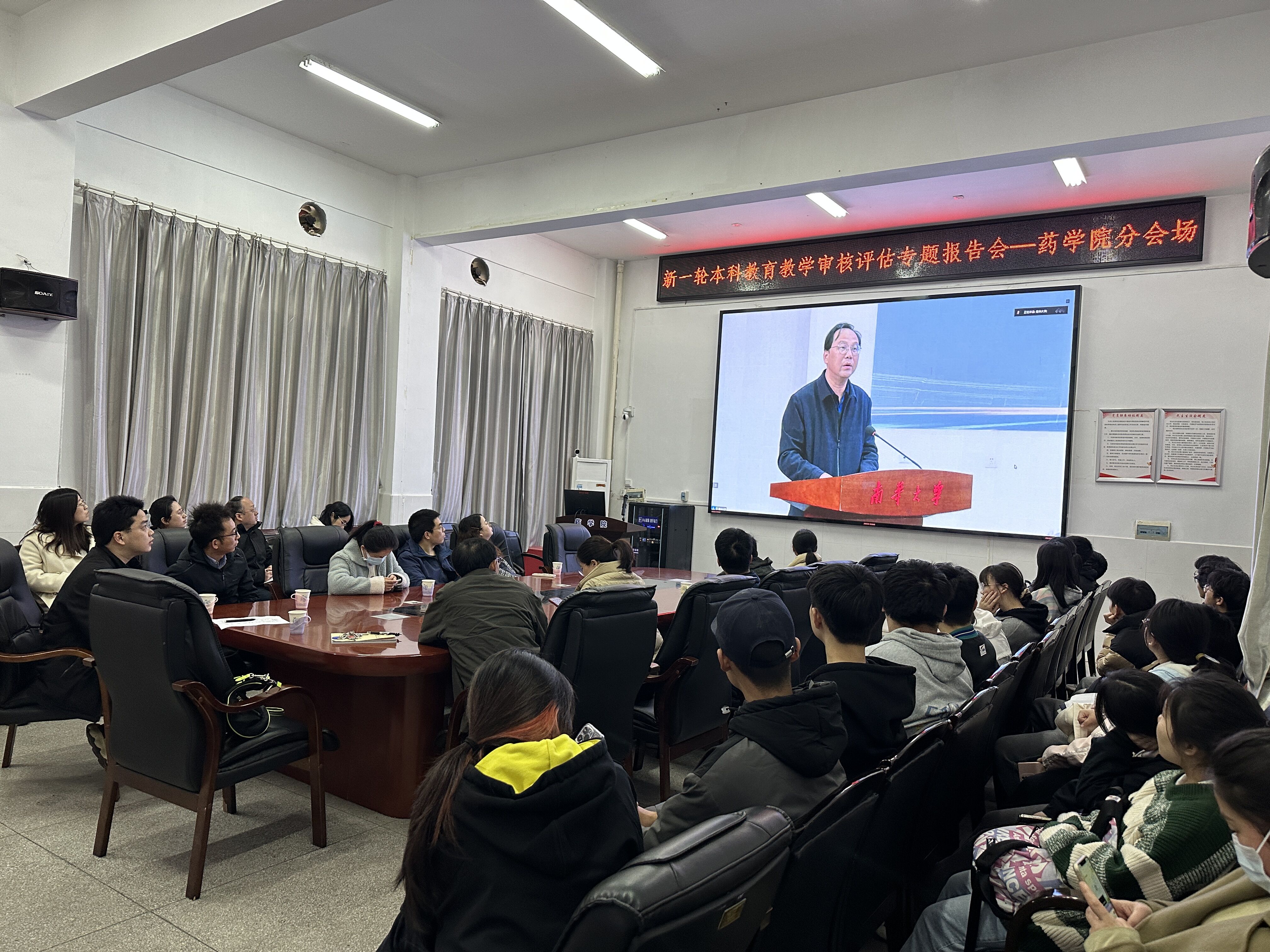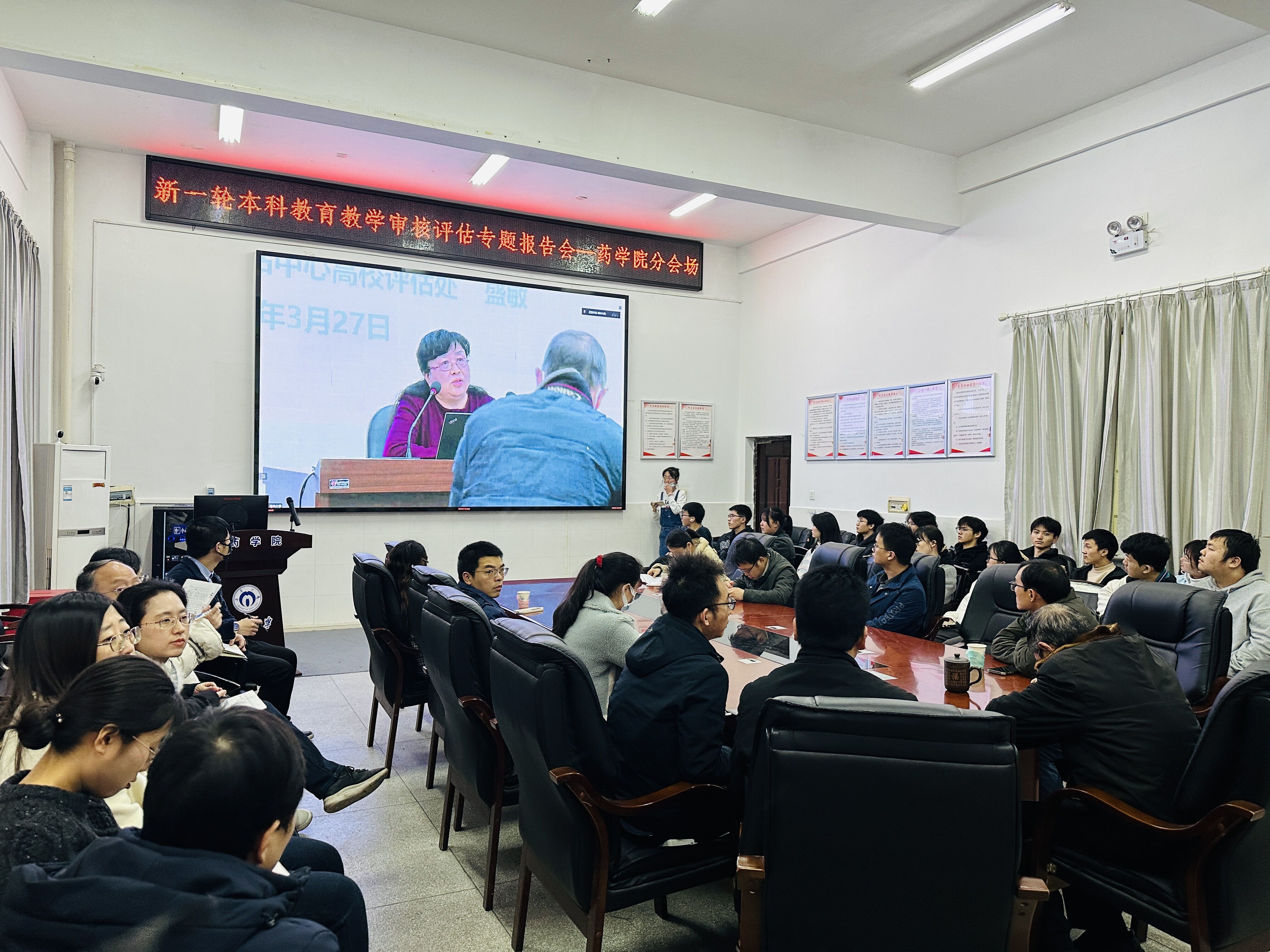 为进一步落实二十大报告要求,扎实做好学校评建工作,3月27日学校召开了党委理论学习中心组(扩大)学习会暨新一轮本科教育教学审核评估专题报告会。报告会邀请教育部教育质量评估中心高校评估处处长盛敏、武汉大学教授黄明东作专题辅导报告,校党委书记高山主持报告会。根据学校统一要求,药学院认真组织全体师生参会学习,处级领导干部参加现场会议,教师和学生代表在药学楼B101会议室集中线上参会学习。